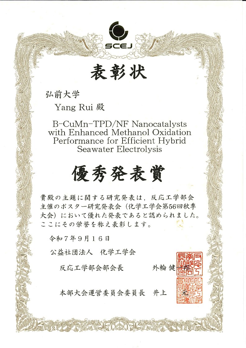 受賞題目: “B-CuMn-TPD/NF Nanocatalysts with Enhanced Methanol Oxidation Performance for Efficient Hybrid Seawater Electrolysis”