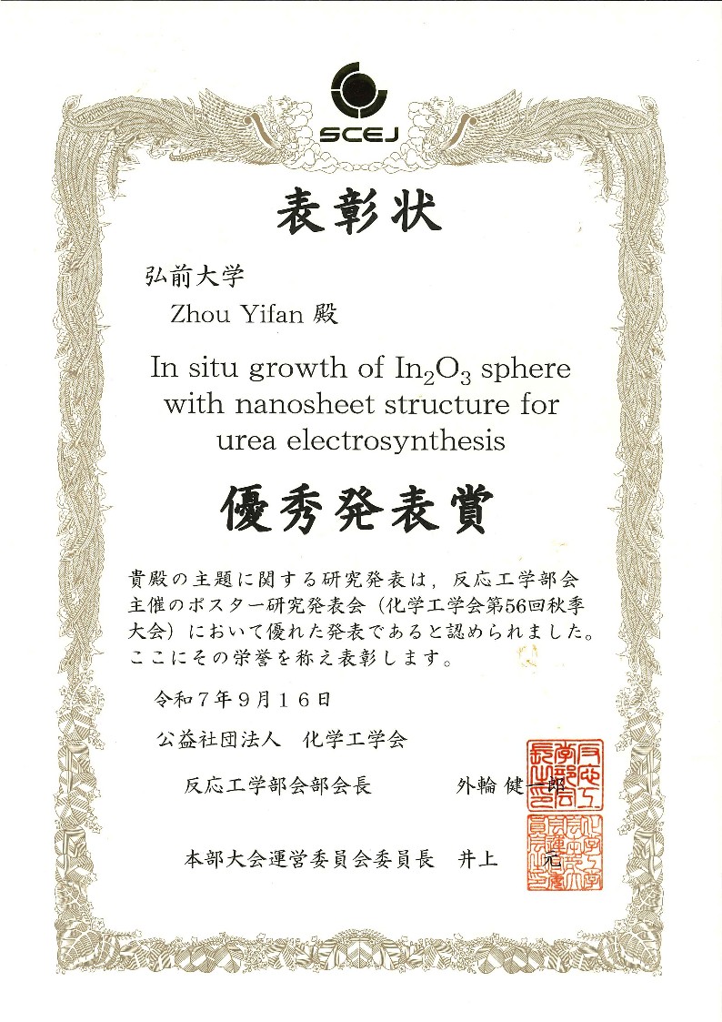 2025年9月16日~9月18日に芝浦工業大学 豊洲キャンパスで開催された化学工学会第56回秋季大会において,官研究室に在籍する理工学研究科大学院生2名が以下の優秀ポスター発表賞を受賞いたしました。