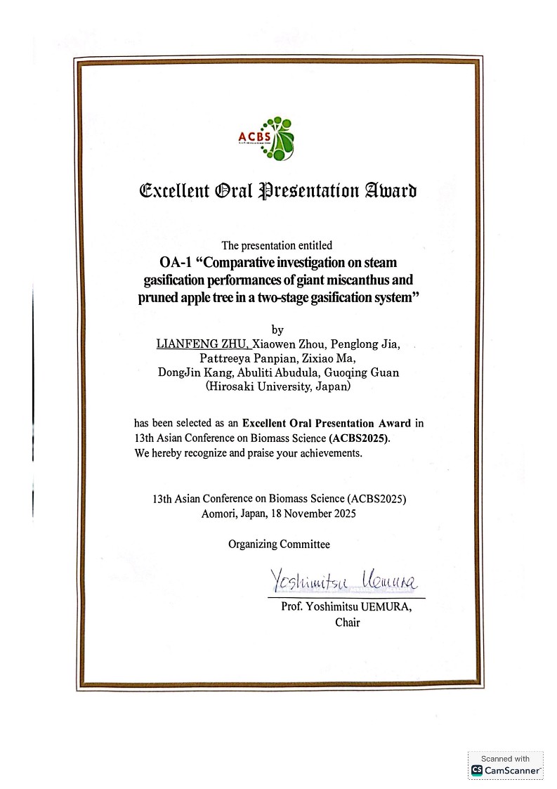 2025年11月18日に弘前大学で開催された第13回アジアバイオマス科学会議(The 13th Asian Conference on Biomass Science、ACBS2025)において,官研究室に在籍する理工学研究科大学院生1名がExcellent Oral Presentation Award、1名がExcellent Poster Presentation Awardを受賞いたしました。