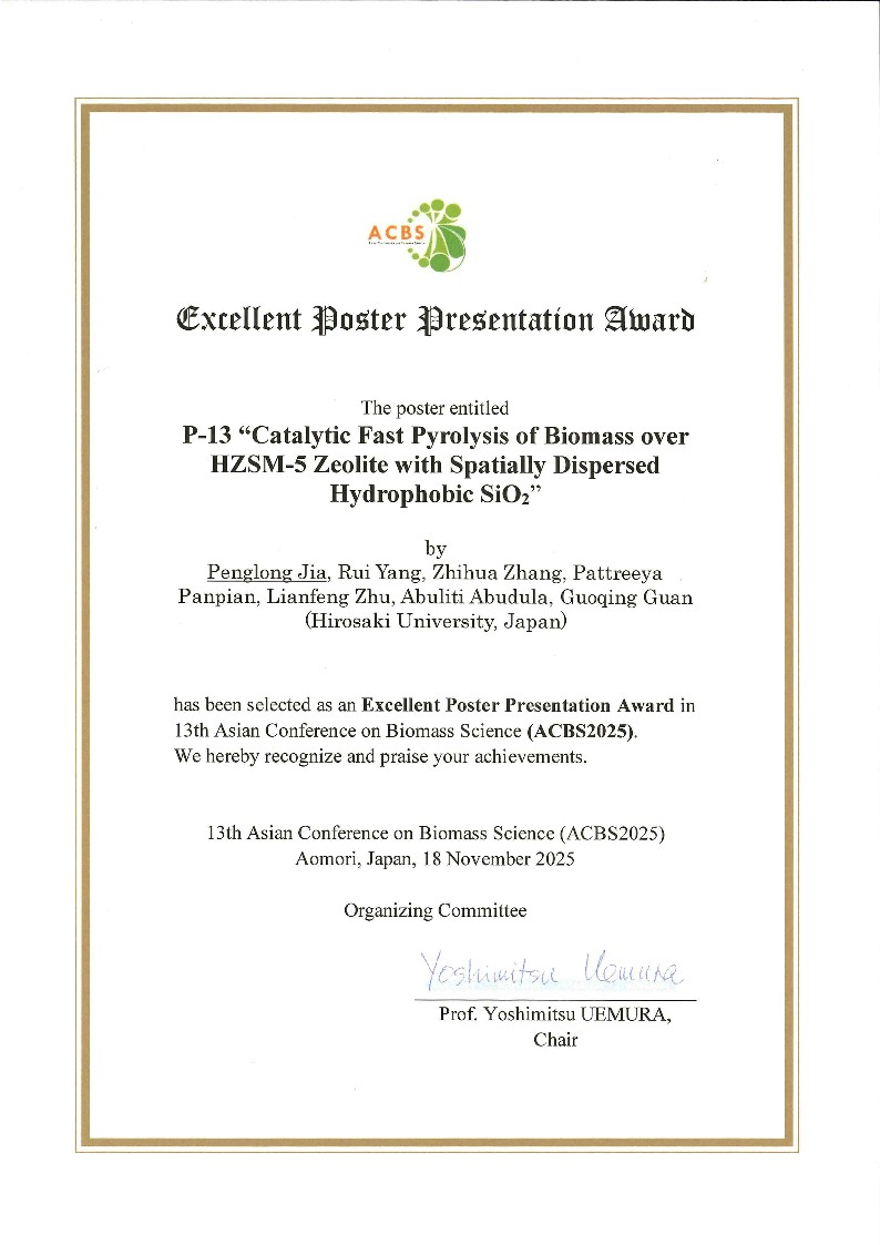 受賞題目: “Catalytic Fast Pyrolysis of Biomass over HZSM-5 Zeolite with Spatially Dispersed Hydrophobic SiO2”